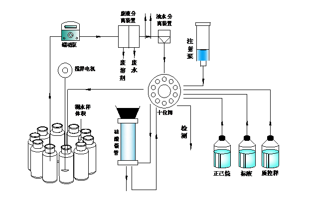 配備無限進(jìn)樣旋轉(zhuǎn)裝置,同時存放10個待測樣品,支持中途添加水樣,設(shè)備自動讀取水樣體積,自動加入定量的萃取溶劑,采用高速旋轉(zhuǎn)混合萃取技術(shù),進(jìn)行水樣萃取,萃取液由油水分離裝置自動分離,除去微量的水,經(jīng)硅酸鎂吸附,吸附后的萃取液輸送至檢測單元進(jìn)行檢測分析,分析結(jié)束后設(shè)備自動完成廢液